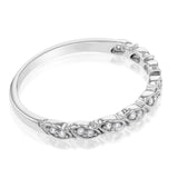 This ring features an elegant dress style with intricate details set into the front side of the ring. The ring has been crafted from luxurious sterling silver and has been set with 10-14 point lab-grown brilliant cut diamonds that sparkle from every angle. The shiny tone of the sterling silver is the perfect accompaniment to diamonds because they compliment the shimmering sparkle.
