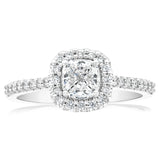 This Luminesce Lab Grown 18ct White Gold 1 Carat Diamond Cushion Halo Ring has an unmatched brilliance. Showcasing a stunning centre 1 carat diamond surrounded by a modern halo design, this ring blends glamour with simplicity. The ring band also showcases intricate diamonds, ensuring that the ring sparkles from every angle. The Luminesce lab grown diamonds are ethically sourced, adding to its allure.