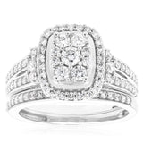 Elevate your special day with the Luminesce Lab Grown Diamond Bridal Set, a true embodiment of grace and elegance. This stunning set features a breathtaking .95 carat lab-grown diamond, meticulously set in lustrous 10ct white gold. The exquisite design captures the essence of timeless beauty and sophistication, while the brilliant lab-grown diamond radiates with unrivalled sparkle and fire. Every facet of these ethically sourced diamonds is precisely cut to maximise their brilliance, creating a dazzling display of light. The sleek and modern white gold band perfectly complements the diamond's brilliance, accentuating its captivating allure.
